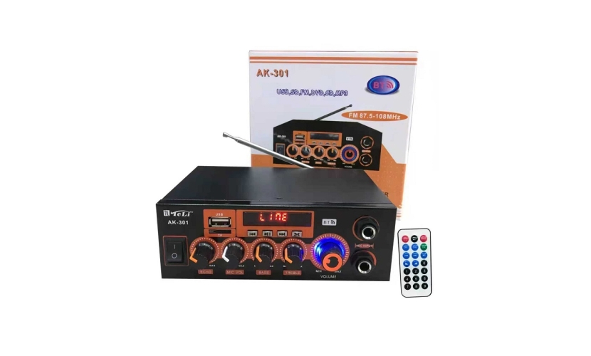 Ψηφιακός ενισχυτής ήχου Mini HIFI με Bluetooth. Χαρακτηριστικά: Αντίσταση: 4-16 Ω, Αναπαραγωγή MP3, Bluetooth, Θύρες: SD/USB/AUX/MIC, Ραδιόφωνο FM, Ρυθμιστές Tremble/Bass/Echo, Ισχύς RMS: 30Wx2, Μέγιστη ισχύς: 300W+300W, Κανάλι: 2.0 - Δύο κύριες έξοδοι καναλιού, SNR: 85 db, Συχνότητα FM: 87,5-108MHz, Ποσοστό παραμόρφωσης: 0,05%, Συχνότητα: 10Hz-20KHz, Τηλεχειριστήριο.
