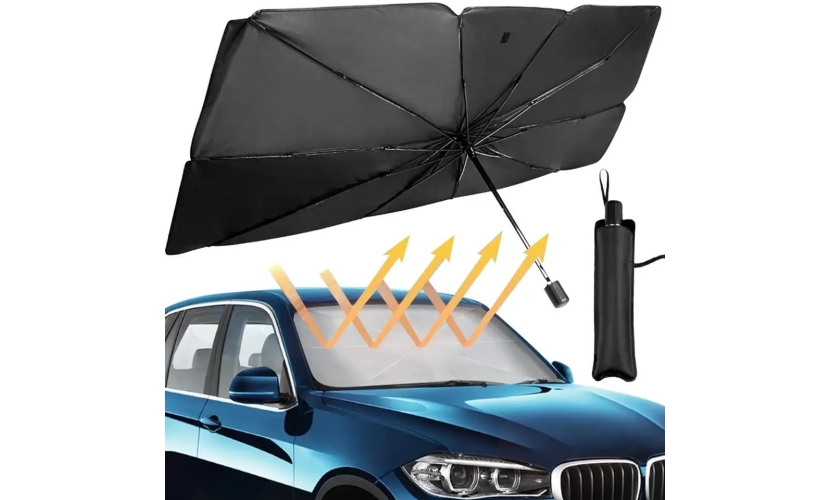 Ηλιοπροστασία αυτοκινήτου με εξαιρετική ανακλαστική προστασία κατάλληλη για όλους τους τύπους αυτοκινήτου που ανοίγει τόσο εύκολα όσο μια κανονική ομπρέλα! Τέρμα ποια οι διαδικασία "άνοιξε κλείσε" τις πόρτες ώστε να πιαστεί η ηλιοπροστασία απλά ανοίγετε την ομπρέλα και την τοποθετείτε στο παρμπρίζ σας και για καλύτερη σταθεροποίηση ανοίγετε τα σκίαστρα οδηγού συνοδηγού! Συνοδεύεται με θήκη προστασίας για εύκολη αποθήκευση στο αυτοκινητο.