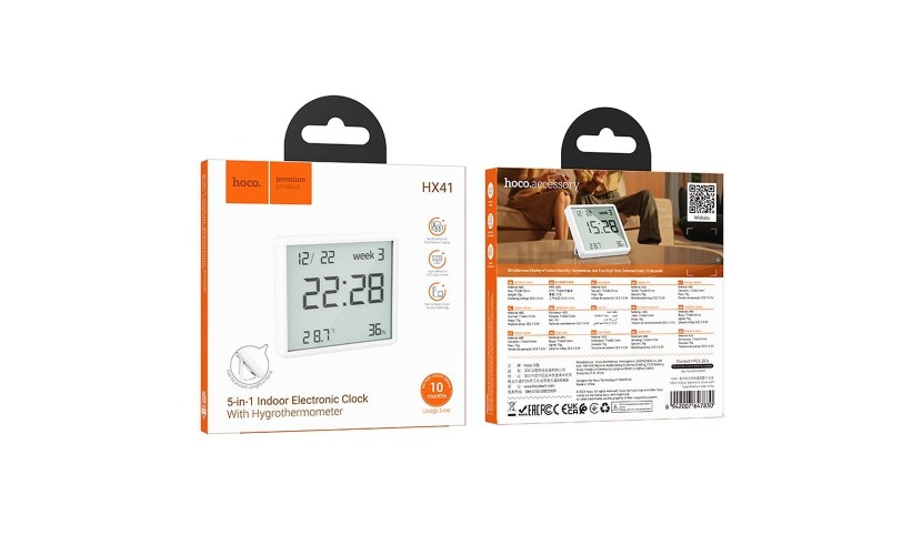 Το HOCO HX41 είναι ένα πολυλειτουργικό ρολόι με μετεωρολογικό σταθμό που συνδυάζει μέτρηση θερμοκρασίας, υγρασίας αέρα και ένδειξη ώρας. Χάρη στην ευκρινή οθόνη LCD, όλα τα δεδομένα εμφανίζονται ταυτόχρονα και ενημερώνονται κάθε 15 δευτερόλεπτα. Είναι μια πρακτική συσκευή για την παρακολούθηση των συνθηκών δωματίου. Ο μετεωρολογικός σταθμός HOCO HX41 είναι κατασκευασμένος από ανθεκτικό πλαστικό ABS, εξασφαλίζοντας μακροχρόνια αντοχή. Χάρη στις μικρές διαστάσεις και το βάρος της, η συσκευή είναι ελαφριά και συμπαγής, γεγονός που της επιτρέπει να τοποθετείται εύκολα σε ένα γραφείο, ράφι ή άλλο μέρος στο σπίτι. Η συσκευή τροφοδοτείται από μια μπαταρία CR2032 χωρητικότητας 200mAh, η οποία εξασφαλίζει μεγάλο χρόνο λειτουργίας χωρίς την ανάγκη συχνής αντικατάστασης της μπαταρίας. Η ταυτόχρονη εμφάνιση θερμοκρασίας, υγρασίας και ώρας σε μία οθόνη LCD διευκολύνει τον έλεγχο των παραμέτρων στο δωμάτιο με μια ματιά.
